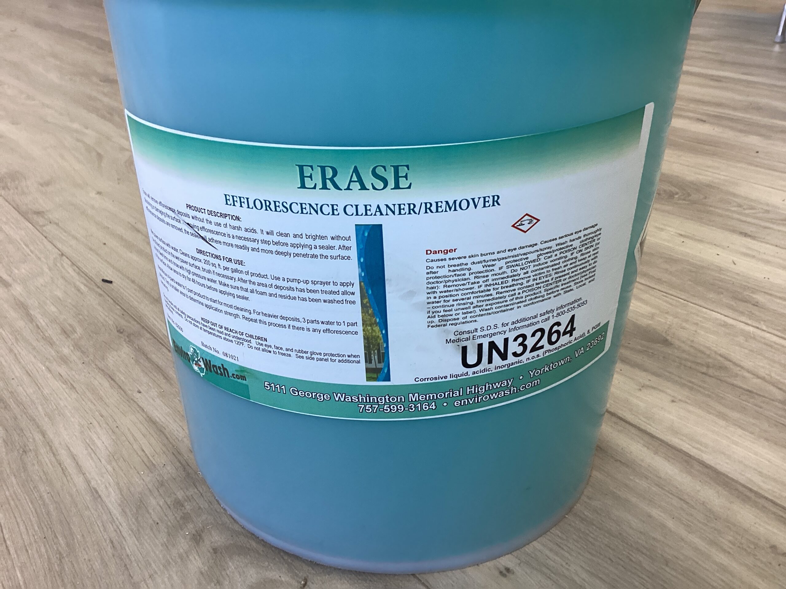 Erase will remove efflorescence deposits without the use of harsh acids. It will clean and brighten without discoloring or damaging the surface. Removing efflorescence is a necessary step before applying a sealer. After efflorescence deposits are removed, the sealer will adhere more readily and will penetrate the surface more thoroughly. Erase is safe for use on concrete, brick, pavers, blocks, and other masonry surfaces.